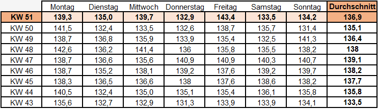 KW 51, Stand 22.12.2025 in Cent: 136,9 Cent/Liter, netto